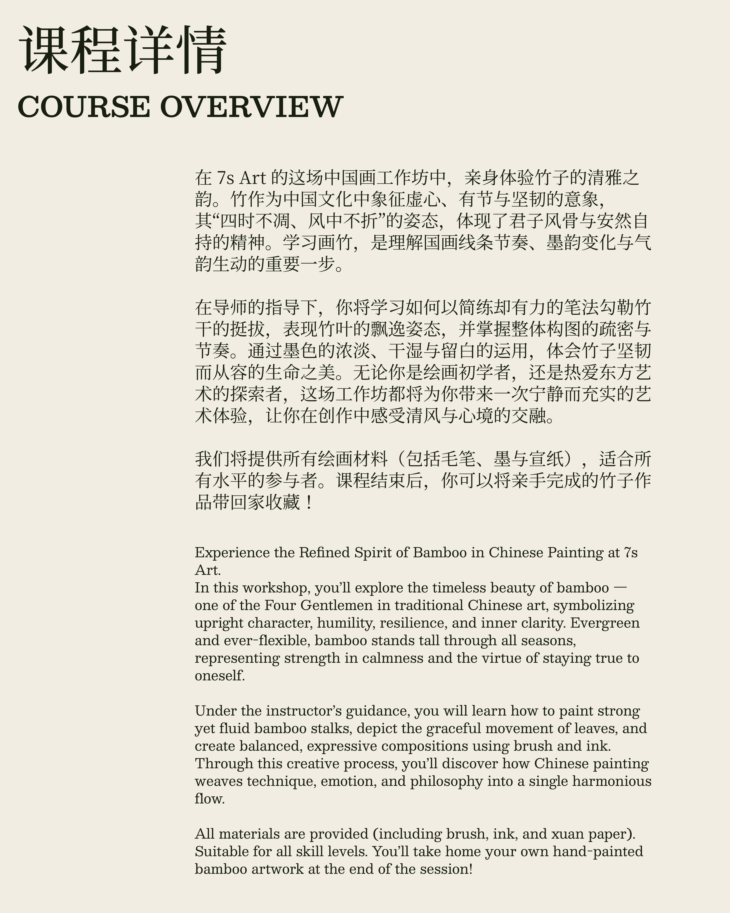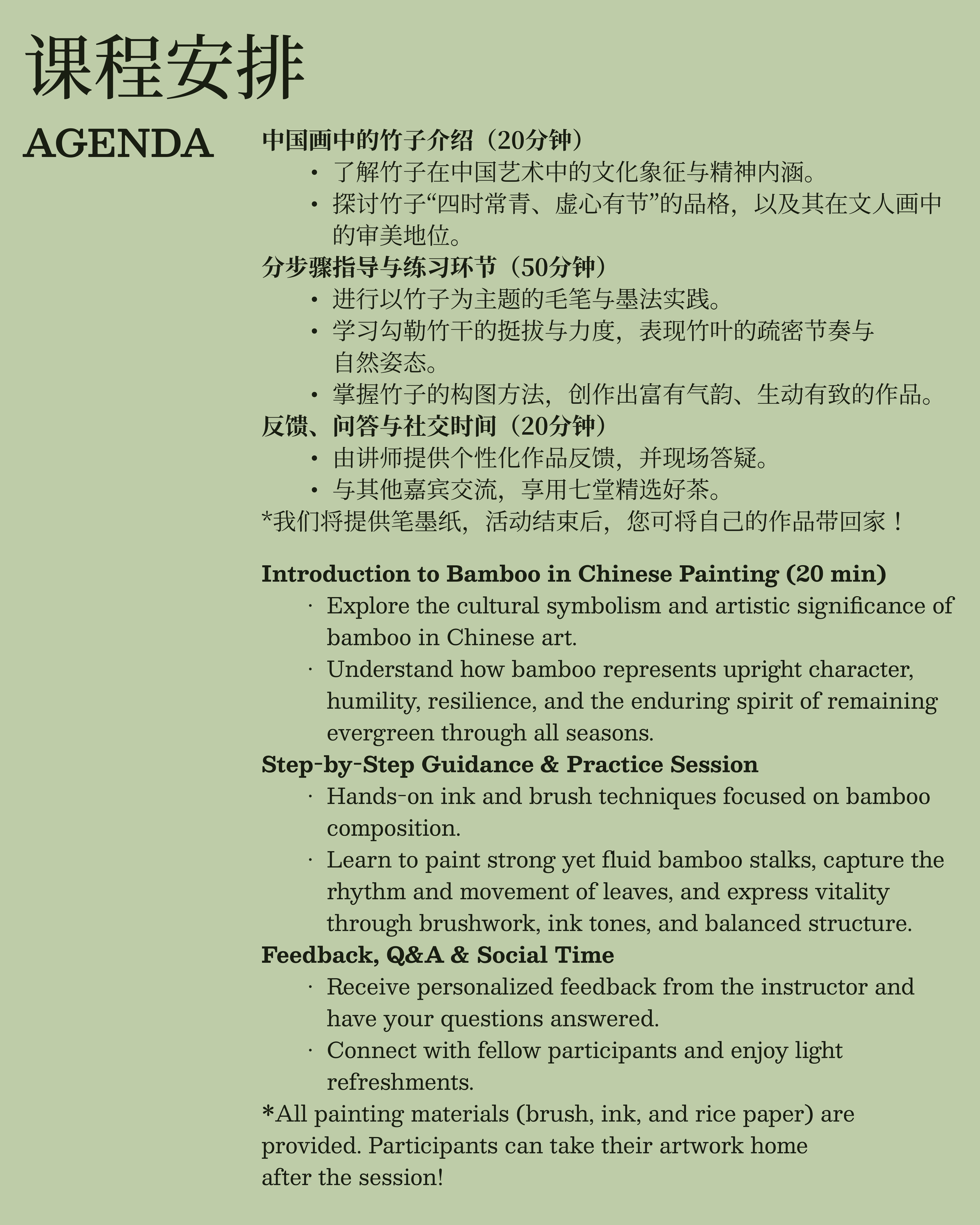 All materials are provided (including brush, ink, and xuan paper). Suitable for all skill levels. You’ll take home your own hand-painted bamboo masterpiece at the end of the session!