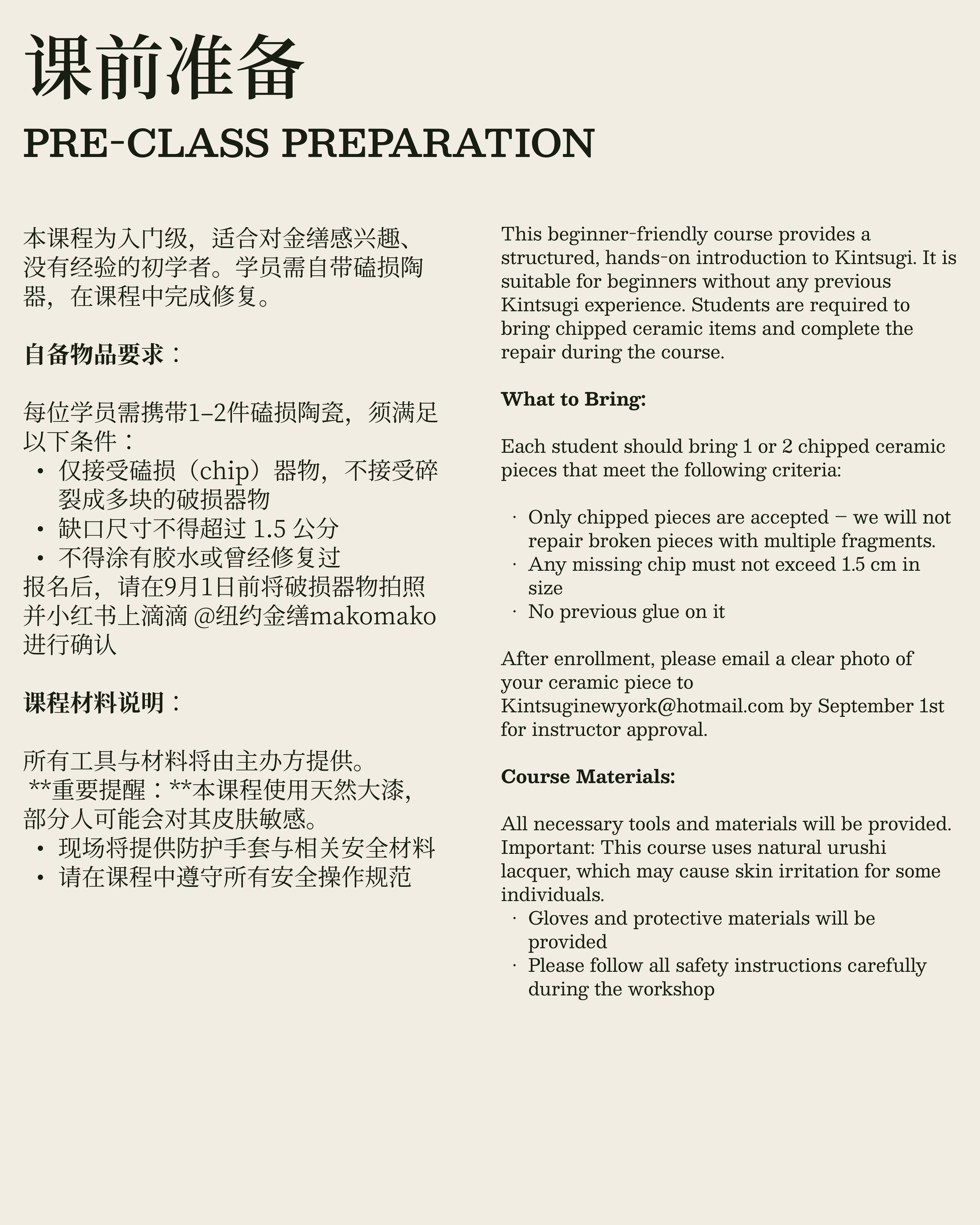 After enrollment, please email a clear photo of your ceramic piece to Kintsuginewyork@hotmail.com by September 1st for instructor approval.